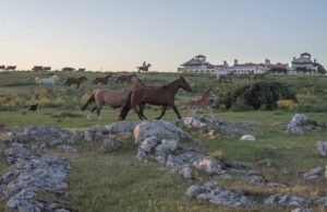 spirada en las estancias tradicionales españolas, combina muros blancos, tejas rojas y patios conectados por jardines y espejos de agua. Arte en cada rincón, vistas a la laguna y piscinas de piedra iluminadas con fibra óptica completan una propuesta que celebra la sofisticación rural.